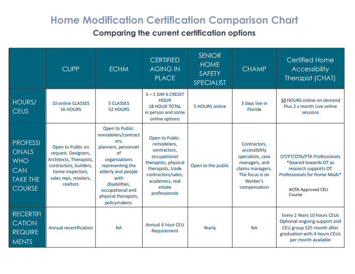 Use our certification chart to compare different accessibility and home modification credentials side-by-side. It’s designed to help you plan your professional development path with clarity and confidence.