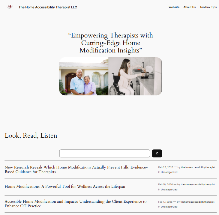 Welcome to our free resource hub designed for therapists, rehab professionals, and accessibility-minded providers. Here you’ll find evidence-informed education, practical tools, and supportive communities to help you confidently address home safety and accessibility in your practice. Explore the links below to keep learning, connecting, and growing your skills—at your own pace.