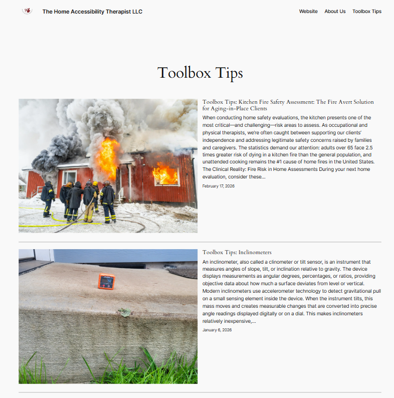 Explore our Toolbox Tips page for practical guidance on the most common tools used in home accessibility and safety assessments. You’ll find clear explanations, clinical pearls, and real-world suggestions to help you select, administer, and interpret assessment tools more confidently in your practice. This resource is designed to save you time, strengthen your clinical reasoning, and support evidence-informed decision-making.